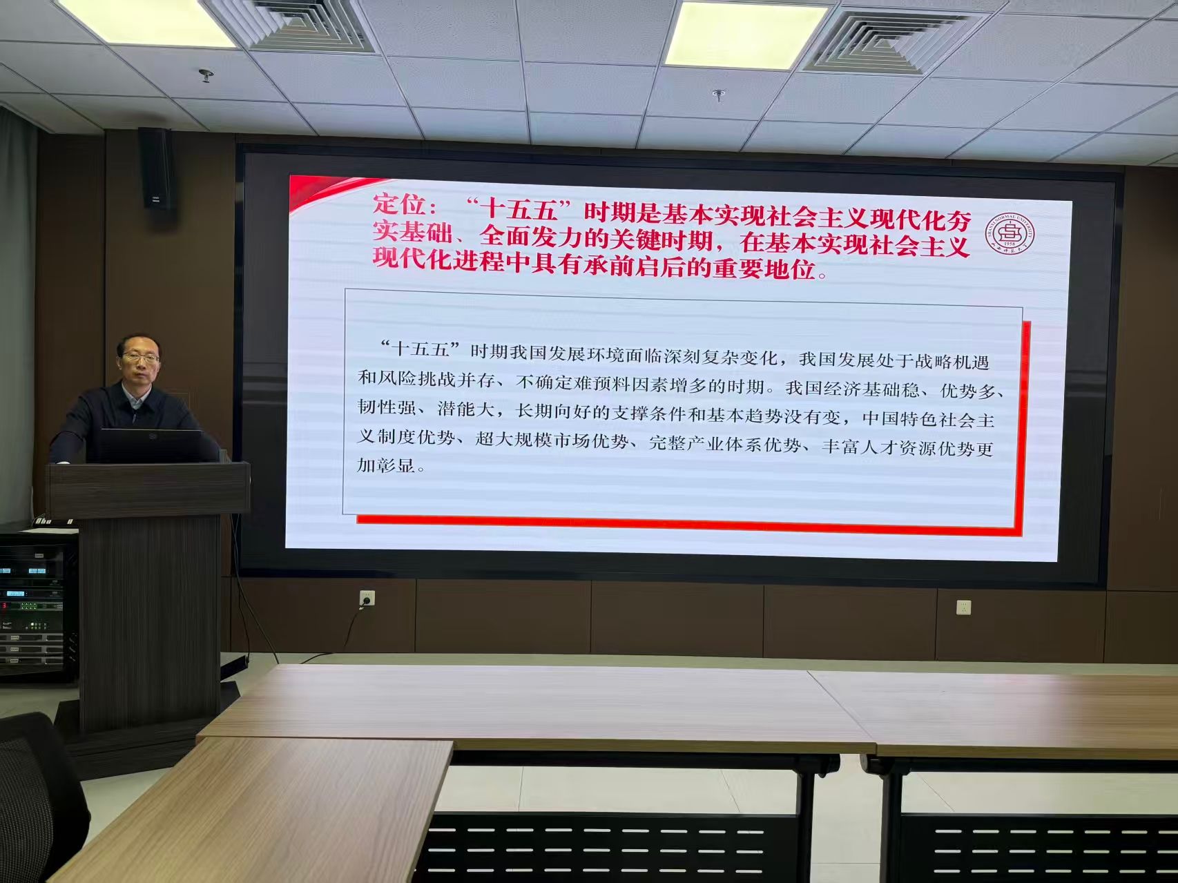 郭继林书记从成绩、定位、目标、任务、保障五个方面宣讲党的二十届四中全会精神内容,他指出,全会系统总结了“十四五”时期我国发展取得的重大成就,明确了“十五五”时期的定位,锚定了“十五五”时期经济社会发展的主要目标,部署了十二个方面战略任务与具体举措,强化坚持党的领导、凝聚各方合力的保障支撑,为强国建设、民族复兴提供了坚实保障。同时,他对同学们提出三点期待:一要立大志,将个人成长融入科技自立自强的时代;二要讲本领,处理好当下和未来的关系;三要守初心,处理好小我与大我之间的关系,以青春之我、奋斗之我不负时代、不负韶华,为强国建设贡献青春力量。