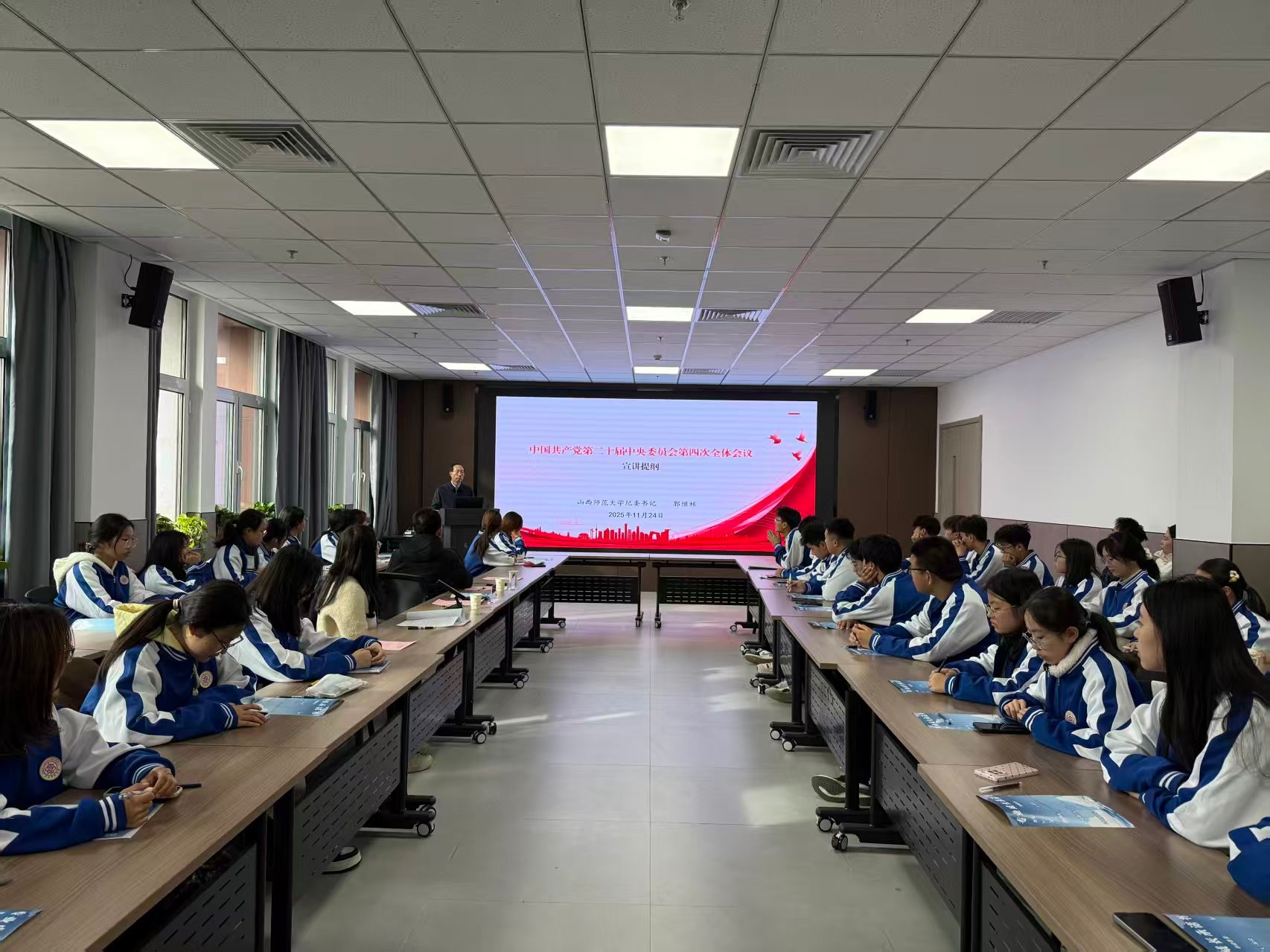 11月24日上午,校纪委书记郭继林深入公司联系班级—25570102班宣讲党的二十届四中全会精神,参加“锚定航向启新程,规划青春赴未来”生涯规划主题班会。