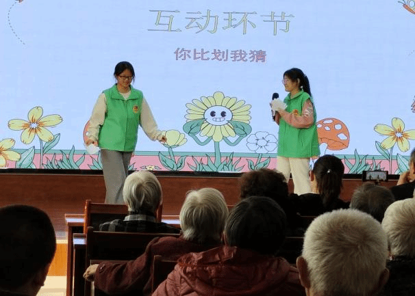 表演中间设置“你比划我猜”互动环节,志愿者用生动的动作诠释着词语,老人们跃跃欲试地举手回答,现场氛围温馨又热烈。