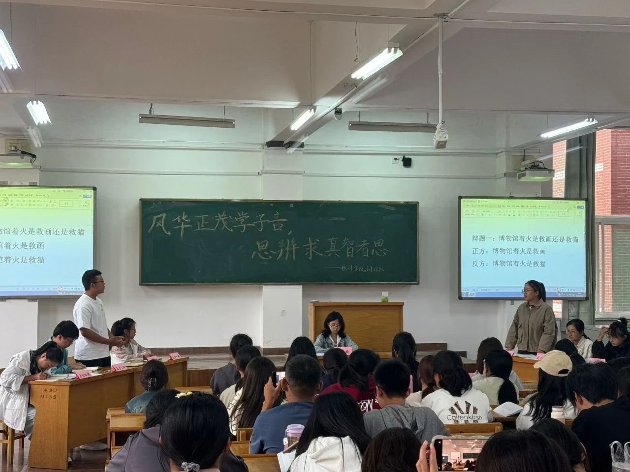 本次比赛双方辩手围绕两个辩题“博物馆着火救画还是救猫”和“21世纪青年做加法更幸福还是做减法更幸福”展开辩论。