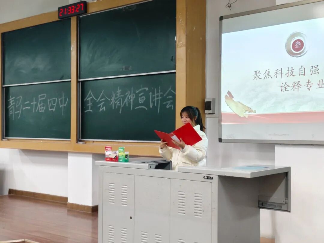 在主题宣讲环节,员工代表夏晓君以“科技自立自强与青年担当”为主题,结合专业特色,分享将全会精神融入学业科研、实践创新的思考和感悟,阐述了新时代青年如何以专业所长践行科技自立自强使命,展现青年扎根专业、勇担使命的责任担当。