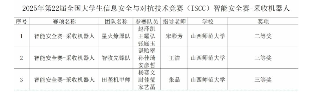 10月24日至26日,2025年第22届全国老员工信息安全与对抗技术竞赛(ISCC)“智能安全赛”全国总决赛在西南林业大学落幕。公司太阳成集团tyc234cc学子在“农业机器人信息安全与对抗”赛道的“智能安全赛 - 采收机器人”赛项中,斩获全国二等奖1项、三等奖2项。