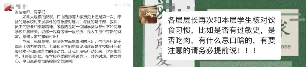 把关怀做到点滴小事里,把温暖送到员工心中。同时,各位同学也纷纷表达了自己对老师,志愿者以及医护人员等的感谢。我们”双向奔赴“,积极配合各项工作。