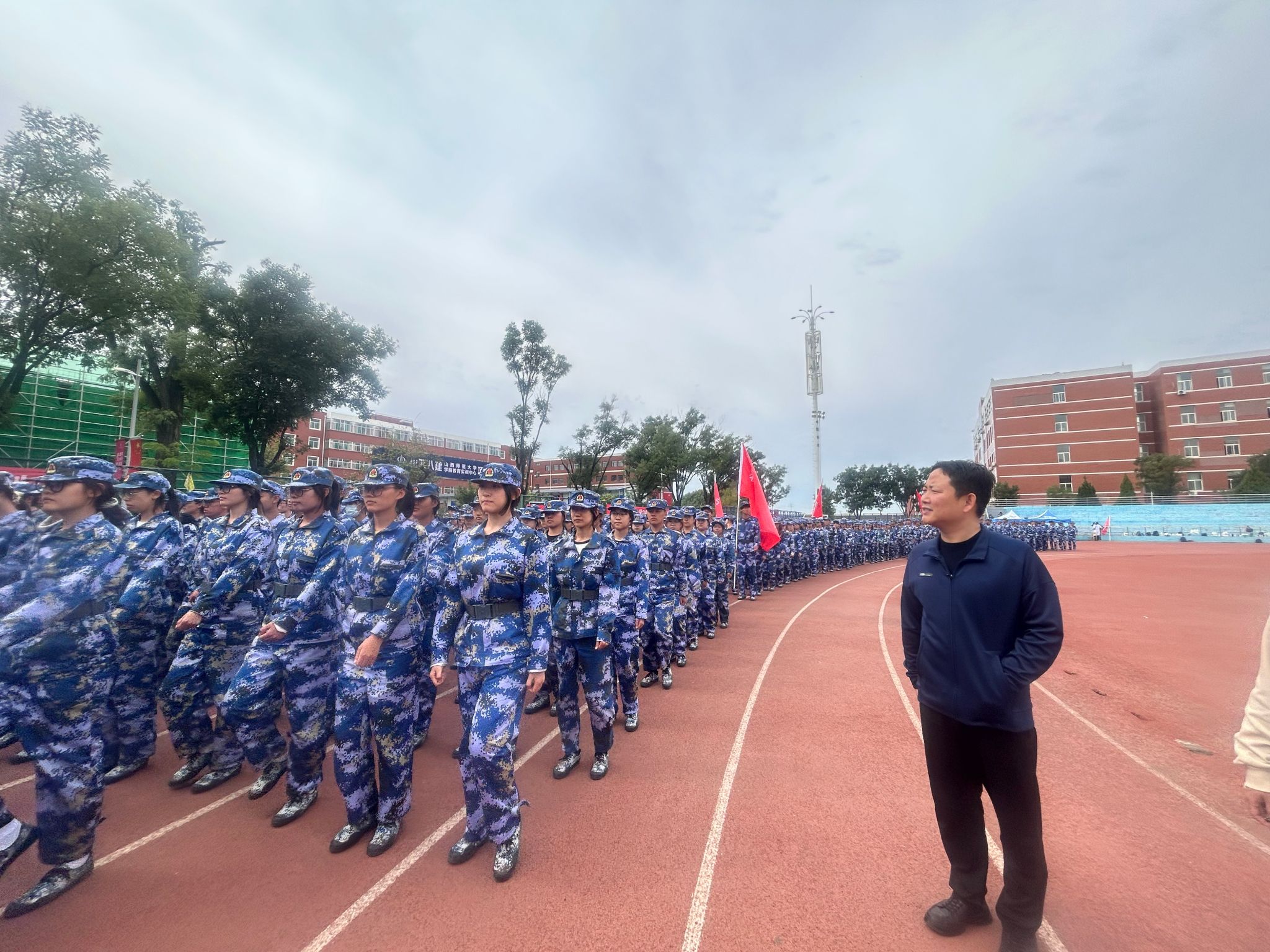 院领导亲临训练现场,检阅方队的训练成果。他们向承训教官的辛勤付出表示感谢,并与参训员工亲切交流,勉励大家刻苦训练、磨炼意志,确保每一位新生能在军训中锤炼作风、收获成长。